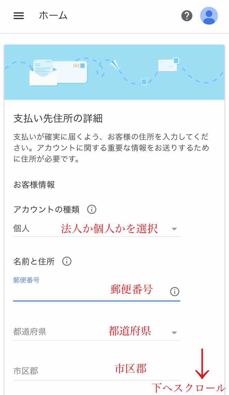 個人か法人かを選択し、郵便番号、都道府県、市区郡を入力し、下にスクロールしてください。