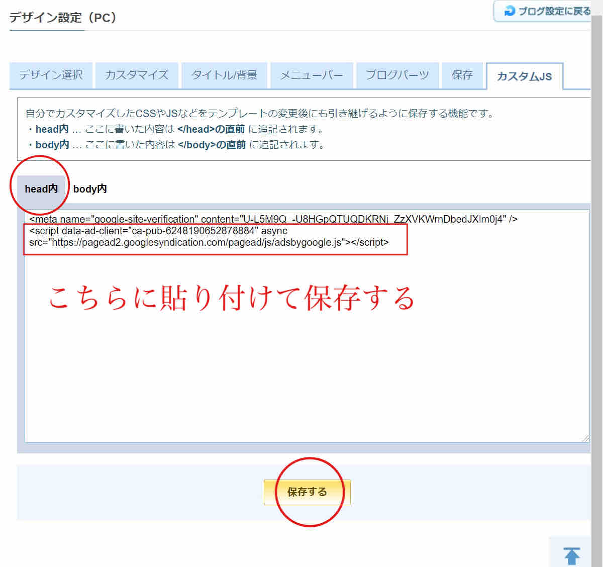 head内にアドセンスコードを貼り付けて保存するをクリックしてください。
