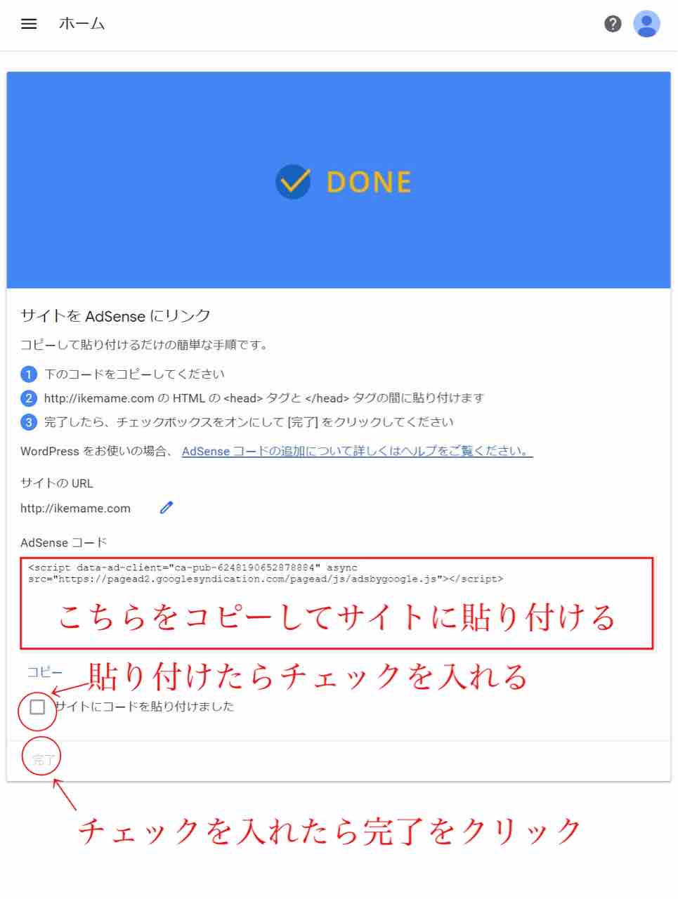 貼り付けたらチェックを入れていただき、完了をクリックしてください。