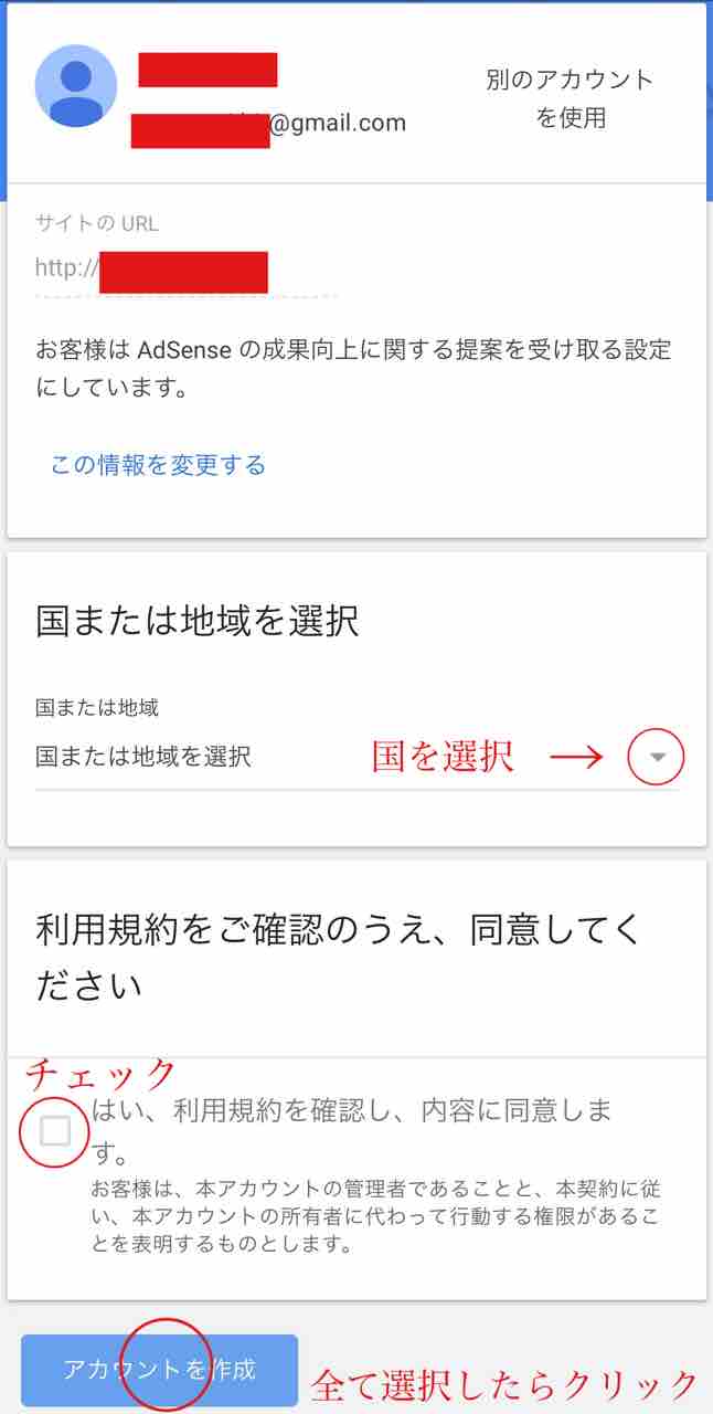 国を選択し、利用規約を確認したらチェックを入れ、アカウントを作成をクリックしてください。
